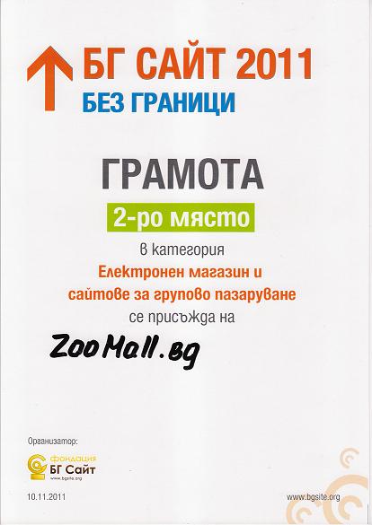 С изключително голямо задоволство бихме искали да Ви съобщим, че онлайн зоомагазин ZooMall спечели награда за 2-ро място за най-добър сайт в категория "Електронен магазин и сайтове за групово пазаруване" на тази годишните награди от БГ САЙТ.