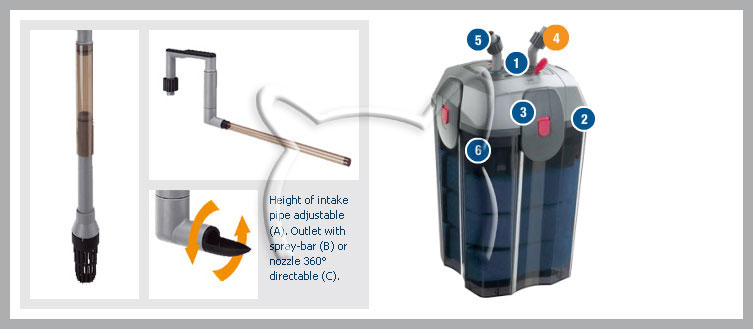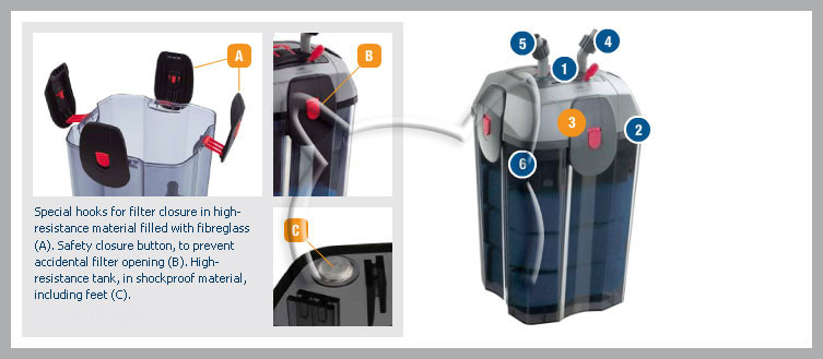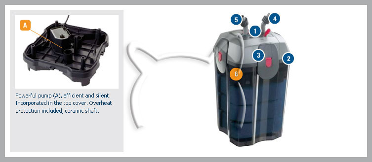 Външен филтър за аквариум, напълно оборудван с филтриращи материали и аксесоари за включване. Капацитета му е да филтрира 1500 литра вода на час. Помпата е с мощност 32 W, изключително надеждна и безшумна, със система срещу прегряване. Обем на филтъра 11 литра. Филтриращите материали се поставят в удобни "кошници", с които лесно се изваждат от филтъра при необходимост от почистване. Обем на биологично-активните съставки 2.5 литра. Подходящ за аквариуми до 500 литра. Размери 26 х 26 х 46 см
