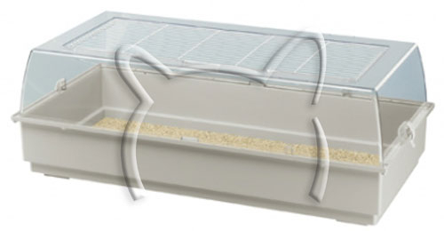 Универсална и много удобна, клетката е с решетъчен покрив и с прозрачни пластмасови странични стени, които предпазват от разпиляване на талаш или сено. Размери: 99/51,5/36 см.