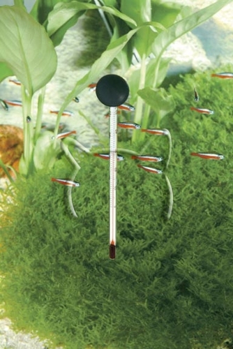 Стъклен термометър за аквариум. Поставя се вътре в аквариума, потопен във водата. Изключително практичен и удобен, той бързо ще отрази всяка настъпила промяна в температурата на водата в аквариума. Прикрепвате го за стъклото посредством вакуумни приспособления за залепване към стената на аквариума.Безопасен и много компактен за използване, той няма да загрози гледката към аквариума ви ако го поставите в ъгъл на страничната стена.