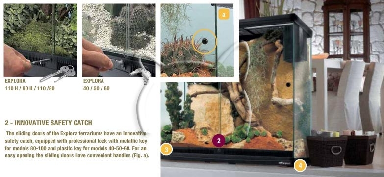 Стъклен терариум с нова усъвършенствана система за вентилация, плъзгаща врата, висок вътрешен праг и ключалка за по-голяма сигурност. Дебелината на стъклото е 4 мм, а височината на вътрешния праг е 7 см.