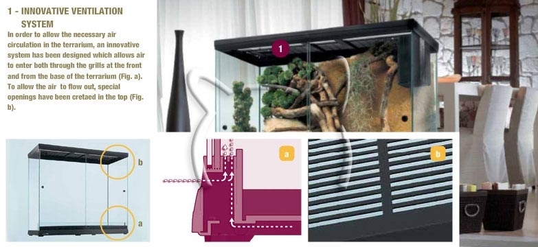 Системата за вентилация гарантира свободно циркулиране на въздуха, без да дава възможност на животното да избяга. Отворите са широки 3 мм. Специално проектирана система осигурява наличие на пресен въздух в терариума, както през предните решетки, така и през основата на терариума, а специална решетка на капака позволява въздуха да излиза нагоре.