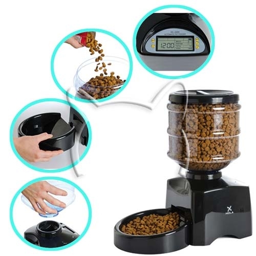 Автоматична хранилка за кучета и котки с капацитет до 5 кг. Храната се поставя в полупрозрачни бункер. По този начин може лесно да следите нивото й. Имате възможност да програмите от 1 до 3 хранения на ден, както и количеството на всяка дажба. Записва звуково съобщение за да привлече вниманието на вашия домашен любимец. Почиства се изключително лесно. Захранва се с батерии D-тип, което гарантират работата на автоматичната хранилка около 6 месеца. Батерии не са включени в комплекта.
