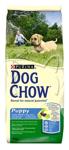 Храни за кученца (2-12 месеца) от едри породи (такива с тегло над 25kg в зряла възраст) имат специфични хранителни нужди. Dog Chow Puppy Large Breed отговаря отлично на нуждите на едрите кученца (2-12 месеца) в най-важните области: здравословнo развитие и изграждане на силни кости и стави. Комбинацията от калций, фосфор, витамин D и протеини, спомага за здрави кости, стави и зъби. Витамин Е и С подсилват имунната система. Храносмилането се подобрява,чрез ориза и специална комбинация от растителни фибри от цикория и цвекло.