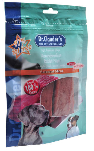 Dr.Clauder Rabbit са филенца от заешки гърди под формата на лакомство за кучета, с фруктоолигозахариди. Не се препоръчва за малки кученца под 4-месечна възраст! Давайте от 2 до 10бр. дневно в зависимост от големината на кучето, като редуцирате и дневната дажба храна. Винаги оставяйте купа с прясна вода на разположение! След употреба затворете пакетчето. Съхранявайте на сухо и прохладно място.