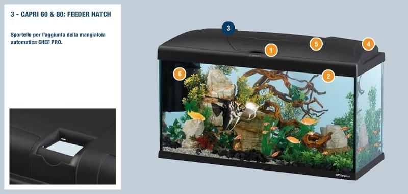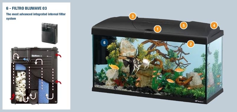 Capri 50 са напълно оборудвани висококачествени аквариуми. Комплектът аквариуми включва: аквариум 40 литра с дебелина на стъклото 5мм, капак с вградена лампа Phillips 15 W T8, интегриран вътрешен филтър за аквариуми Bluwave 03 за крастално чиста вода, снабден с филтриращи материали за механична, биологична и химическа филтрация на водата. Нагревателят за аквариуми BluClima 75W се грижи за температурата на водата с индикатор показващ кога водата се затопля. За него е предвидено отделение във филтърната кутия. Освен това в оборудването е включена надеждна и безшумна помпа за аквариуми Blupower 250 l/h с ниска консумация на енергия, за която също е предвидено специално отделение вътре във филтърната кутия. Размери: 52/27/36 см. Тегло на аквариума в пълно състояние: 50 кг. Две години гаранция.