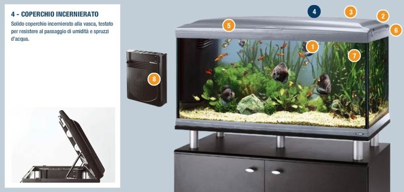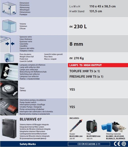 Аквариумът Ferplast Cayman 110 Scenic Black е с атрактивен дизайн в съчетание с модерен интериорен акцент, леко увеличителното предно стъкло придава още по-внушителен ефект и поднася всеки детайл с кристална яснота. Комплектът на аквариумите Cayman 110 Scenic включват: аквариум 300 литра с дебелина на стъклото 8 мм, капак с вградена лампа Phillips 2 х 30 W T8, интегриран вътрешен филтър Bluwave 09 за крастално чиста вода, снабден с филтриращи материали за механична, биологична и химическа филтрация на водата. Нагревателят за аквариуми BluClima 300W се грижи за температурата на водата с индикатор показващ кога водата се затопля. Освен това в оборудването е включена надеждна и безшумна помпа за аквариуми Blupower 1200 l/h с ниска консумация на енергия. Масивна рамка допълва перфектно дизайна на аквариума и позволява да поставяте филтъра в разнообразни позиции. Аквариумът разполага с удобен люк за хранене на рибките и таймер за програмиране на осветлението. За повишаване на сигурността са предвидени бутони за отключване на капака. Бутон, прекъсващ захранването на помпата и нагревателя - позволява да изключите помпата и нагревателя от електрическата мрежа, докато почиствате и поддържате аквариума. Един контакт за включване на цялата апаратура. Тегло на аквариума в пълно състояние: 370 кг. Размери: 110 х 45/55 х 61,5 см. Две години гаранция.