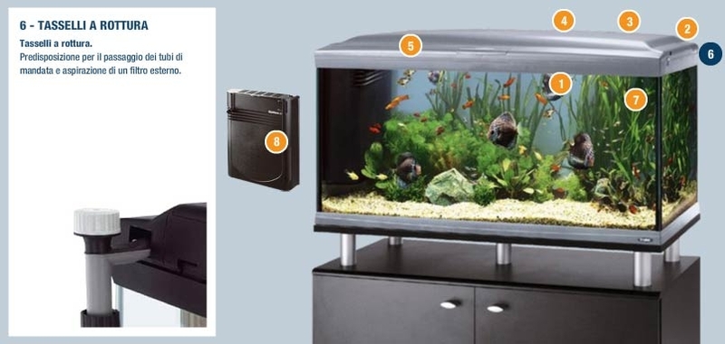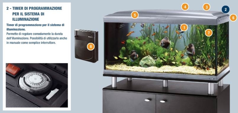 Масивна рамка допълва перфектно дизайна на аквариума и позволява да поставяте филтъра в разнообразни позиции. Аквариумът разполага с удобен люк за хранене на рибките и таймер за програмиране на осветлението. За повишаване на сигурността са предвидени бутони за отключване на капака. Бутон, прекъсващ захранването на помпата и нагревателя - позволява да изключите помпата и нагревателя от електрическата мрежа, докато почиствате и поддържате аквариума. Един контакт за включване на цялата апаратура. Тегло на аквариума в пълно състояние: 200 кг. Размери: 81.5/36/52.5 см. Две години гаранция.
