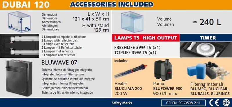 Dubai 120 Walnut са напълно оборудвани висококачествени аквариуми. Комплектът аквариуми включват: аквариум 240 литра, капак с вградени лампи Т5 Freshlife 39 W,Toplife 39 W, интегриран вътрешен филтър за аквариуми Bluwave 07 за кристално чиста вода, снабден с филтриращи материали за механична, биологична и химическа филтрация на водата. Нагревателят за аквариуми BluClima 200W се грижи за температурата на водата с индикатор показващ кога водата се затопля. За него е предвидено отделение във филтърната кутия. Освен това в оборудването е включена надеждна и безшумна помпа за аквариуми Blupower 900 – 900 литра/час с ниска консумация на енергия, за която също е предвидено специално отделение вътре във филтърната кутия, както и таймер. Размери: 121/41/56 см.