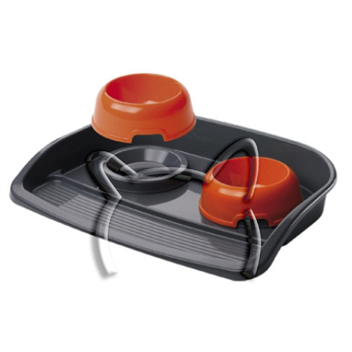 Две отделни пластмасови купички прикрепващи се към специална поставка за по-добра хигиена във вашия дом. Вместимост на купичките - 500 мл, предлагат се в сив или оранжев цвят. Размери на таблата - 53/39/8 см, предлага се в бял цвят. Комплекта е подходящ за котки и кучета от малките породи.