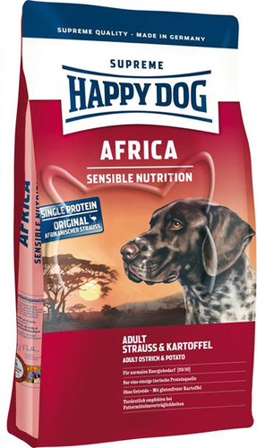 Happy Dog Africa е храна за кучета, които проявяват хранителна непоносимост. Съдържа един източник на протеини – щраусово месо. Африканския щраус е изключителен и рядък източник на протеини и поради това е идеален за кучета с хранителна непоносимост. Това месо се характеризира с специфичен вкус и лесна смилаемост. Happy Dog Africa се препоръчва за кучета с непоносимост към зърнените продукти. Храната не глутен. Храната за кучета Africa е с уникална комбинация от щраусово месо и картофи, което я прави много подходяща за капризни кучета и кучета с чувствителни стомаси.