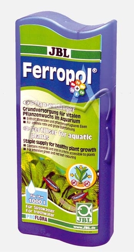 JBL Ferropol е течна тор за аквариумни растения с микроелементи. Усвояването на хранителните вещества се осъществява през листата. Съдържа всички необходими минерали и микроелементи (желязо, калий и други) в леснодостъпна и усвояема за растенията форма. Не съдържа фосфати и нитрати, предизвикващи образуването на вредни водорасли. Лекува хлороза и недостиг на калий. Добавете 5мл/20л, или веднъж седмично, или след като сте използвали JBL Fe Test Set.
