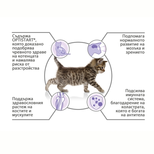 PRO PLAN Junior Optistart съдържа специфична комбинация от съставки, научно разработени да окажат въздействие върху благоприятното развитие на малките котенца от 1 до 12 месеца. Също така се препоръчва за бременни и кърмещи котки. PRO PLAN Cat Junior съдържа всички жизненоважни хранителни вещества, включително витамини С и D, DHA и коластра. Храната доказано подсилва чревното здраве на малкото коте и намалява риска от разстройство. Благодарение на коластрата, богата на антитела, спомага за по-силна имунна система. Подкрепя здравословното развитие на костите, мускулите, зрението и мозъка. PRO PLAN Junior Optistart е подходяща за кастрирани котенца.