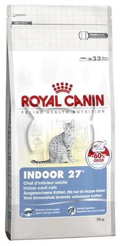 Royal Canin Indoor 27 е висококачествена храна за поддържане на идеално телесно тегло на котки живеещи вкъщи. Котките живеещи само удома, са подложени на понижена физическа активност, което трябва да се компенсира с намаляване на приема на енергия, което спомага за избягване появата на наднормено тегло. Слабата физическа активност води и до храносмилателни проблеми, които водят до отделянето на меки фекалии с неприятна миризма. Royal Canin Indoor 27 спомага за намаляване на миризмата породена от фекалиите и тяхната консистенция. Спомага за отстраняването на космените топки, подпомага борбата срещу стареене. Поддържа добрата устна хигиена, като ограничава появата на зъбен камък. Профилактика срещу образуването на уринарни камъни.