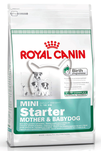 Храна за кучета от малка порода след отбиването до двумесечна възраст, както и за бременни или кърмещи кучки. Спомага за прехода от мляко към твърда храна. Съдържа висококачествен протеин и мазнини. Задоволява високите енергийни нужди на майката в края на бременността. Ако залеете гранулите с вода, те лесно омекват и се получава великолепен деликатесен сос. Royal Canin Mini Starter Mother & Baby е храната, която посреща нуждите както на бременната и кърмеща майка, така и на съвсем младото кученце от първите седмици до двумесечна възраст. Храната съдържа изключителна комбинация от хранителни вещества, съдържащи се в майчиното мляко, подсилени със специфични съставки, допринасящи за доброто храносмилане и засилващи естествената имунна защита.