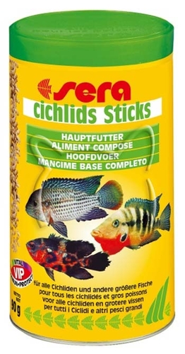 Sera Cichlids Sticks е здравословна основна храна за цихлиди и други едри риби. Храната е съобразена със специалните изисквания на цихлидите с висока усвояемост.
