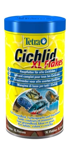 Tetra Cichlid XL Flakes е висококачествена храна за цихлиди и други едри декоративни рибки. Храната е лесно смилаема. Съдържа мастни киселини, източник на енергия за рибката, имуностимулатори и витамини за по-голяма устойчивост към болести и добавки, които подсилват естествените цветове.