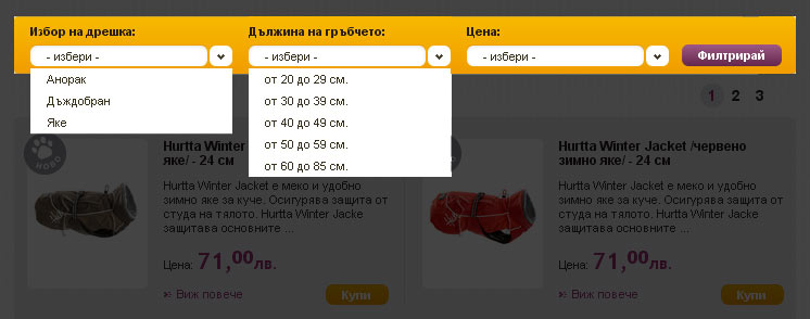 Поради голямата гама от размери и цветове, zoomagazin ZooMall сложи филтър за да се ориентирате по-лесно във Вашия избор. Екипът на zoomagazin ZooMall се стреми да Ви спести време при избора на храни, аксесоари или дрехи, за да имате повече свободно време, за Вас, домашния любимец или семейството, затова ние от zoomagazin ZooMall подредихме филтрите по следния начин: В първия филтър може да си изберете типа дреха (яке, дъждобран или анорак), с втория филтър избирате диапазона на дължината на гърба на Вашето куче, а с третия цената. Така ще направите по-бърз и лесен избор.