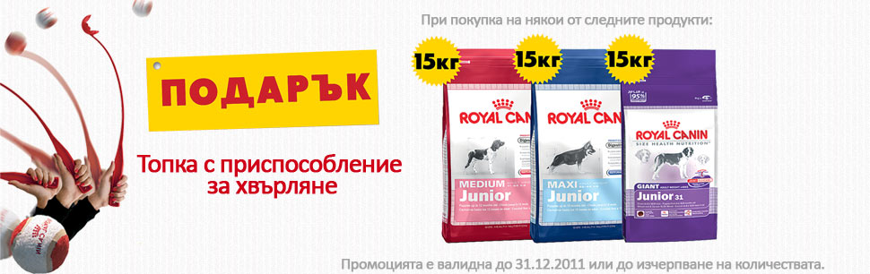 Поредната промоция в zoomagazin ZooMall. Коледа настъпи по-рано. Само сега до 31.12.2011 имате страхотна възможност, да вземете Вашия подарък. При покупката на чувал от 15 кг. Medium Junior, Maxi Junior или Giant Junior, за всеки чувал ще получите подарък - топка с приспособление за хвърляне. Приспособлението ще Ви помогне да по-лесно да хвърляте топката и да забавлявате повече Вашето куче. Освен качествените продукти в zoomagazin ZooMall, екипът ни се грижи и за стопаните на кучета. Промоцията в zoomagazin ZooMall е валидна до 31.12.2011 или до изчерпване на количествата.